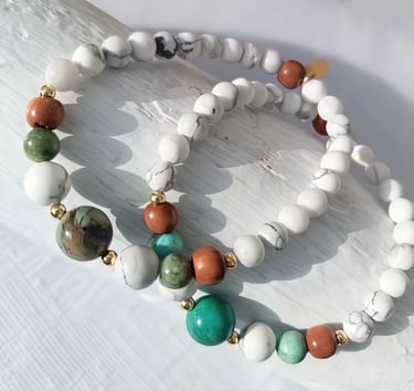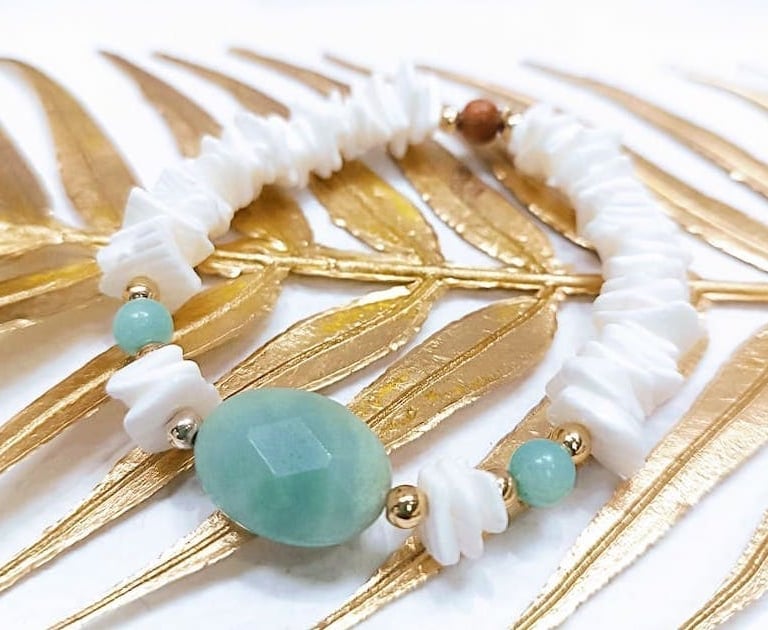 Composé de fragments de coquillage blanc évoquant l'écume des vagues, de perles d'hématites dorées pour une touche d'éclat solaire et d'une pierre centrale en Amazonite facettée, symbole de paix intérieur et d'harmonie, ce bijou est une invitation au calme et à la beauté naturelle